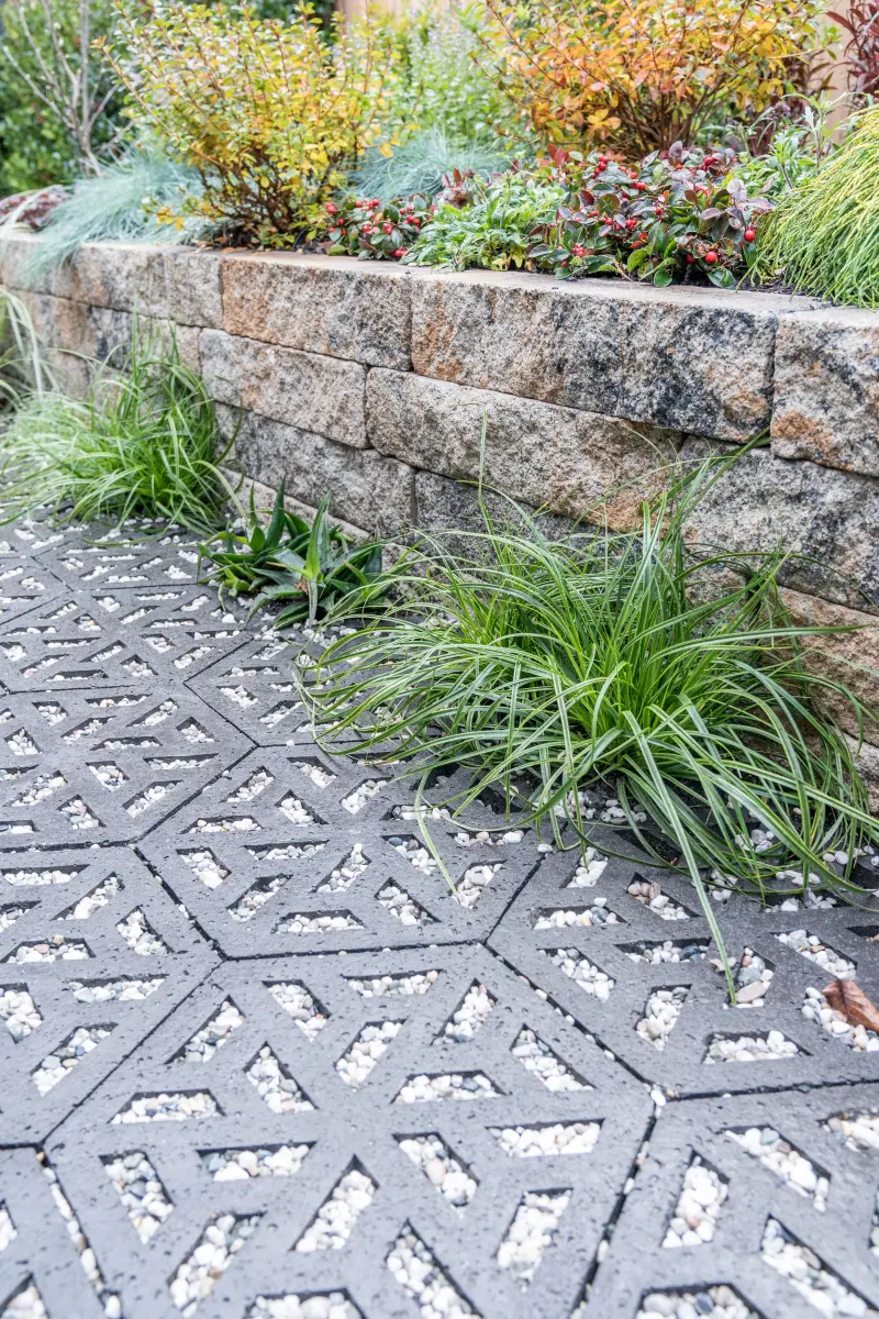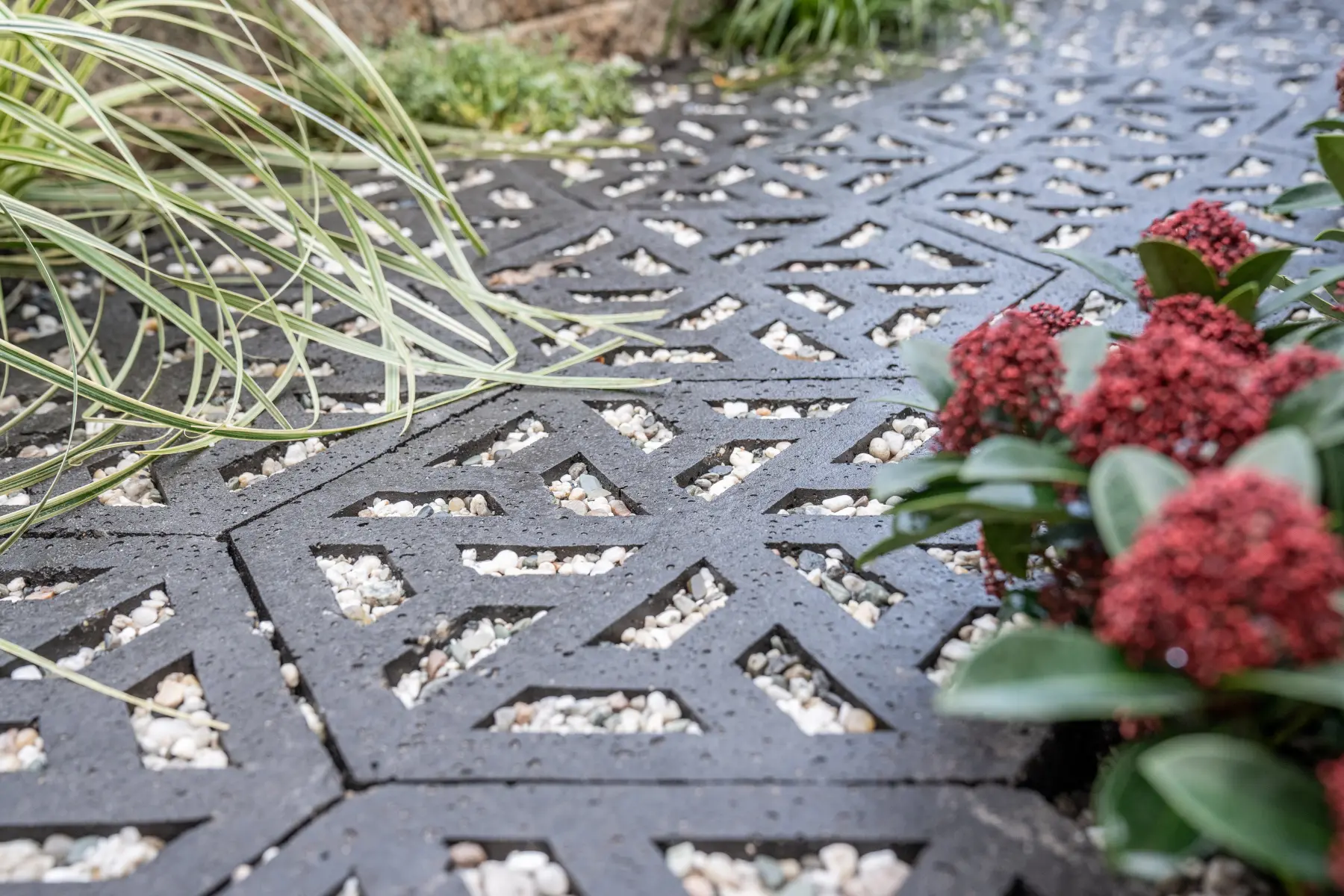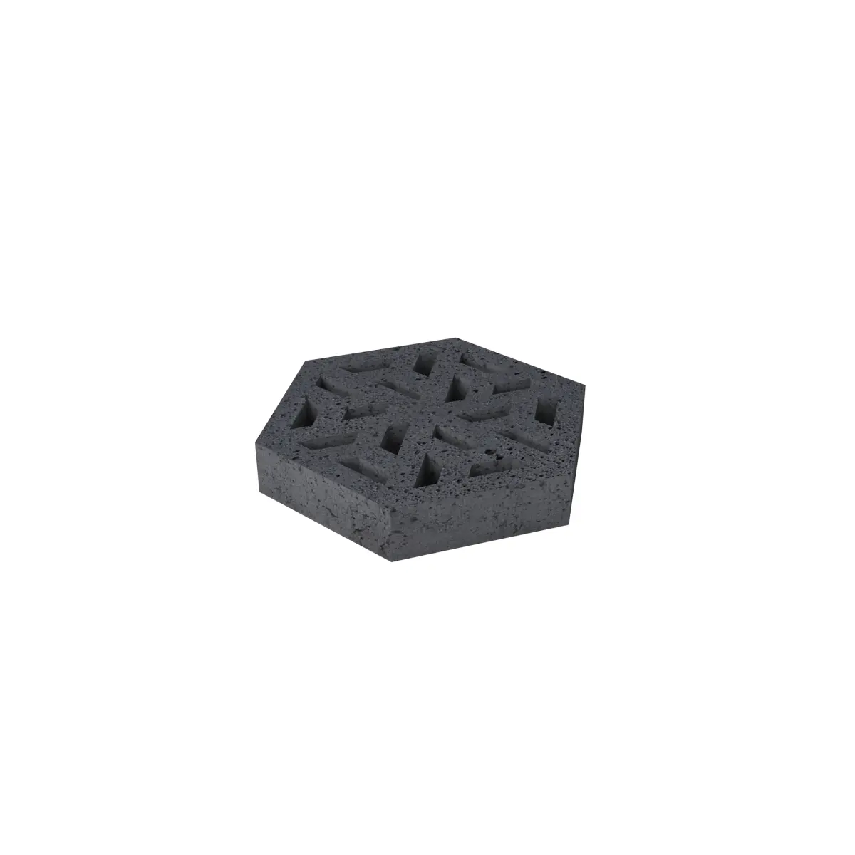 Deze zeskanttegel heeft een trendy hexagonvorm met speelse uitsparingen. Ze zijn te vullen met split, grind of groen voor een stijlvolle en eigentijdse uitstraling.
