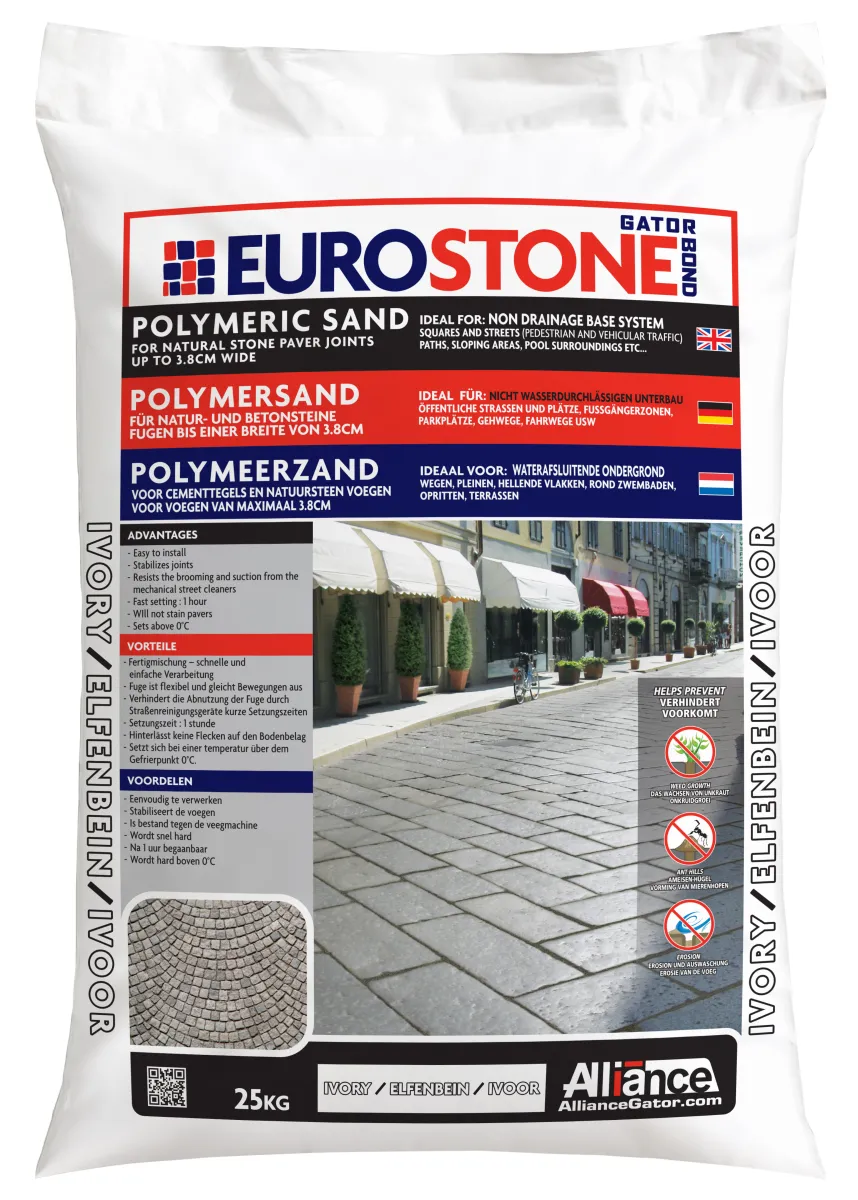 EUROSTONE BOND is het eerste polymeerzand, speciaal ontworpen voor natuursteenbestratingen. Het wordt gebruikt in toepassingen met drainagesystemen. Het is perfect voor zwembadranden, terrassen, voetpaden, opritten, opritten van natuursteen, parkeerplaatsen, klinkerwegen en pleinen. Dit complete multifunctionele polymeerzand is verkrijgbaar in beige, antraciet, ivoor en zwart. Het hardt uit boven 0°C en kan gebruikt worden voor voegen van maximaal 3,8 cm.