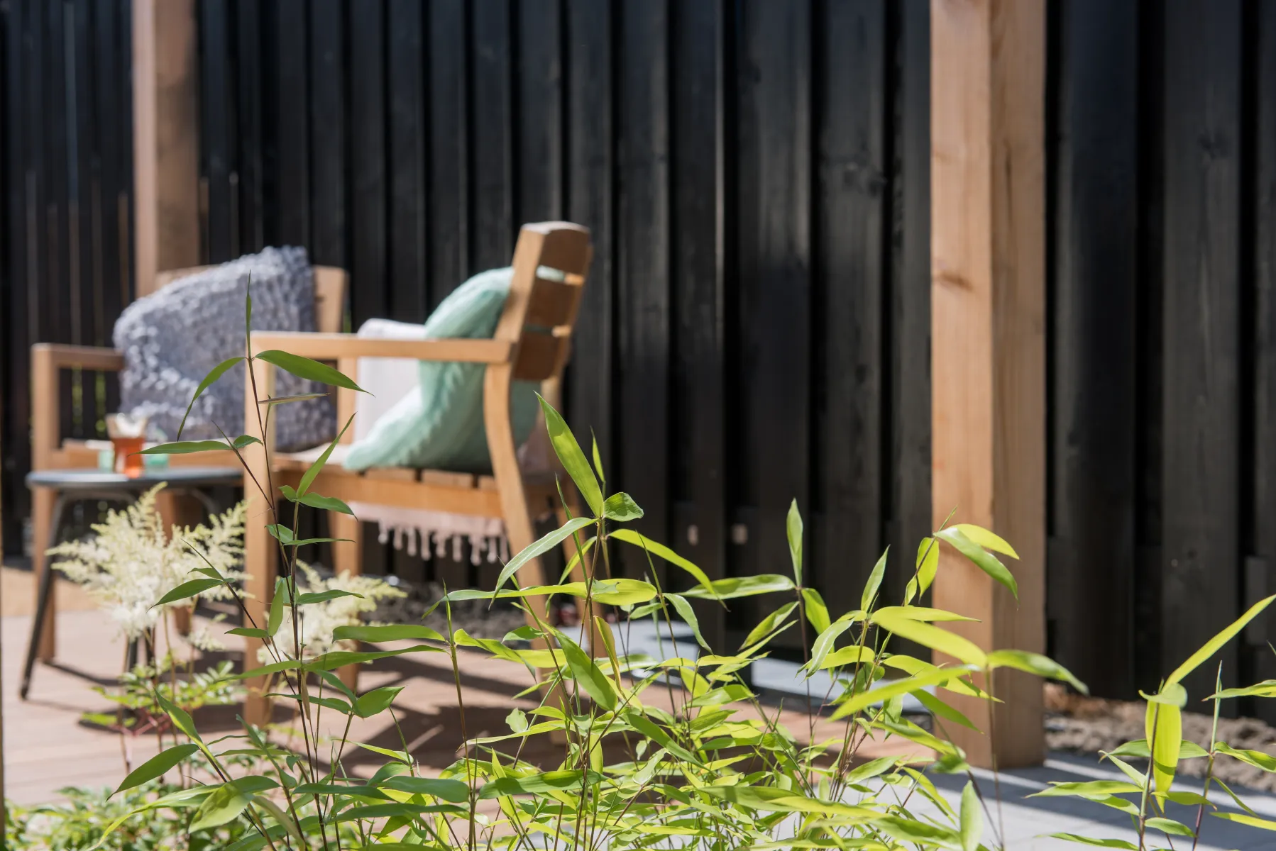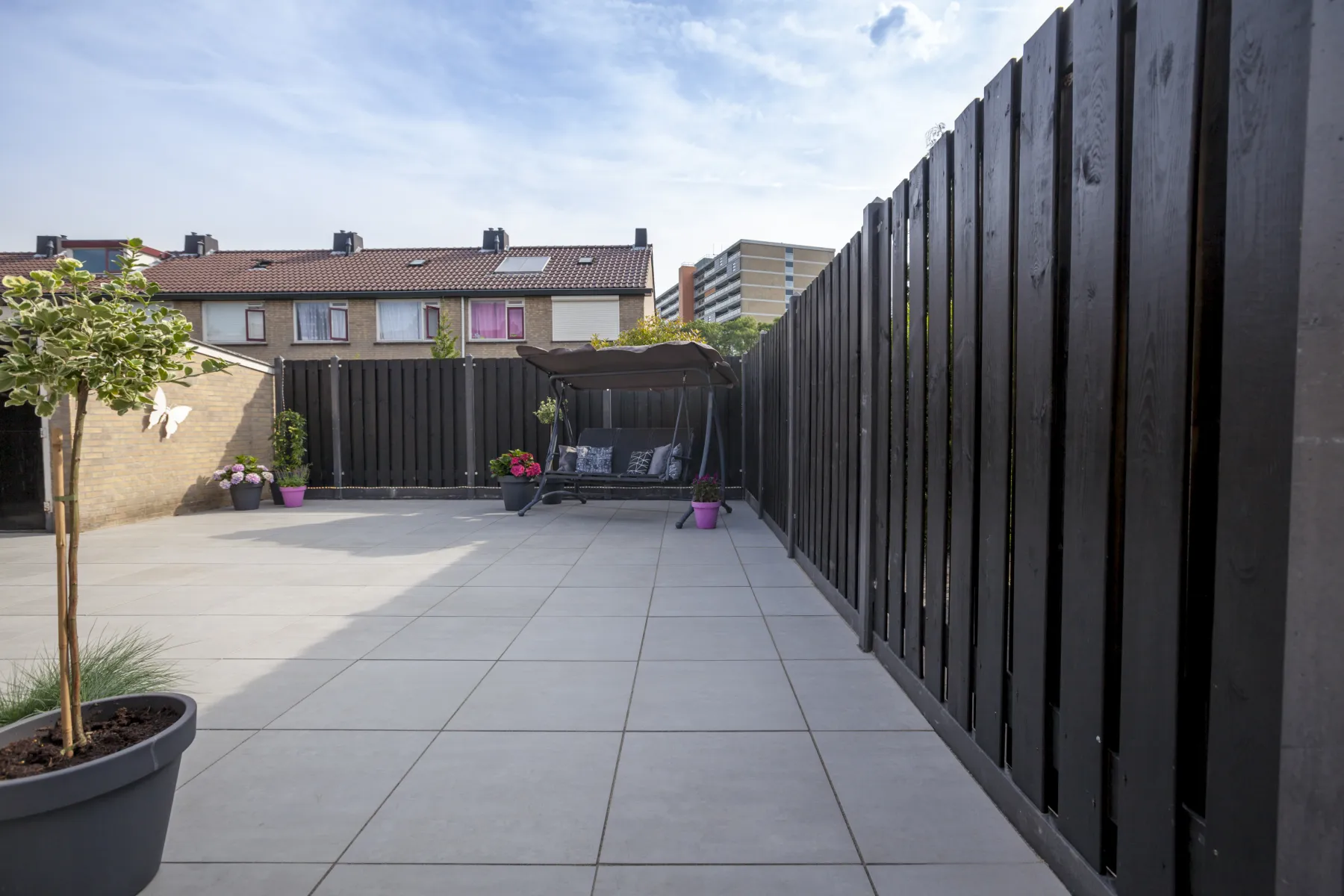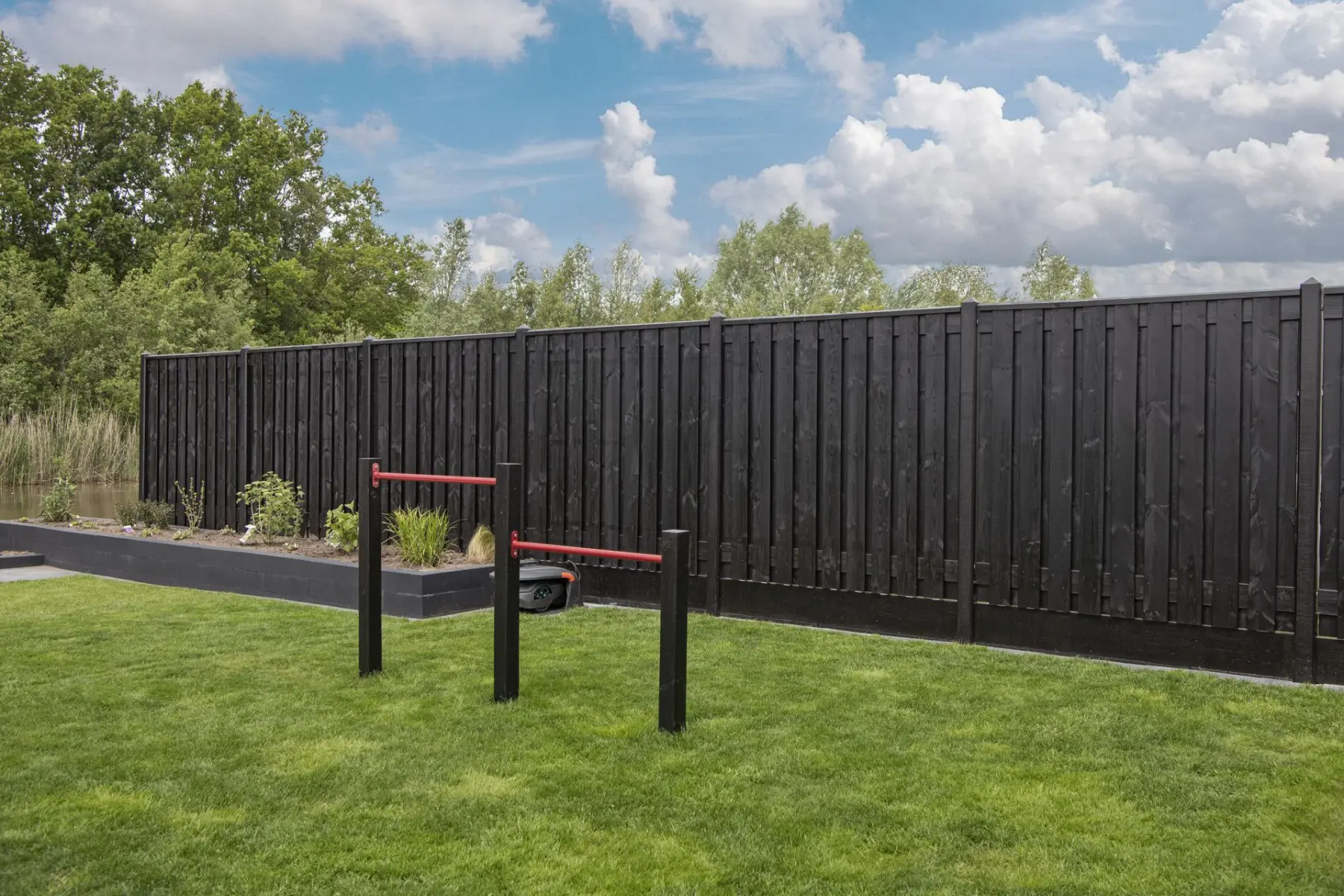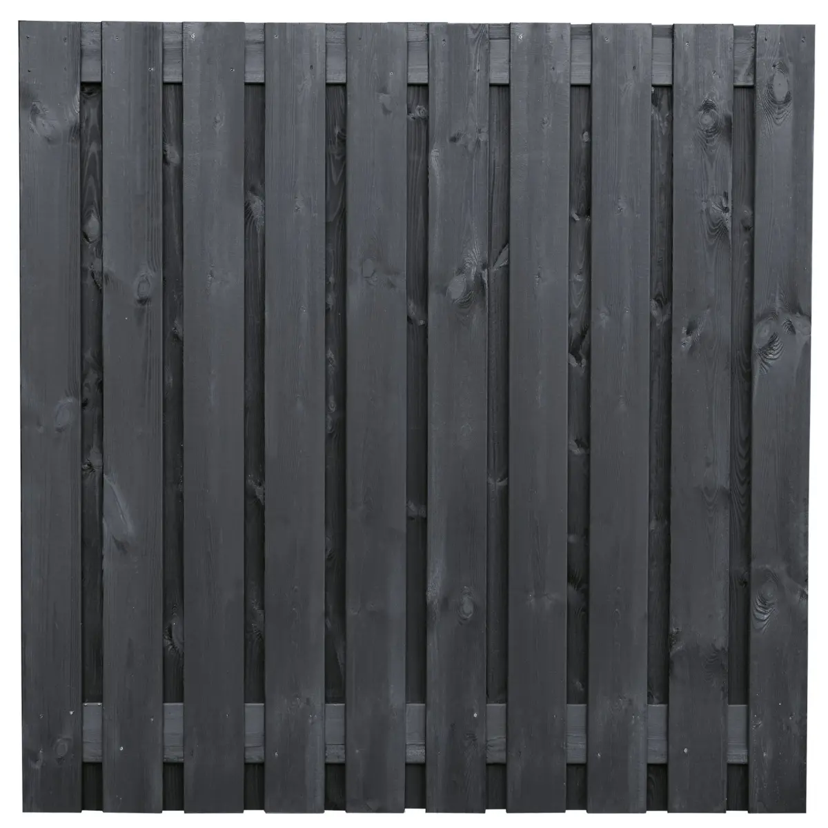 Tuinscherm Breukelen is opgebouwd uit 19 geschaafde vuren planken van 1,6×14 cm en is zwart gespoten. Het scherm is voorzien van 2 tussenplanken, waarop de planken met RVS schroeven zijn bevestigd. Dit zorgt voor een solide constructie en een nette afwerking.